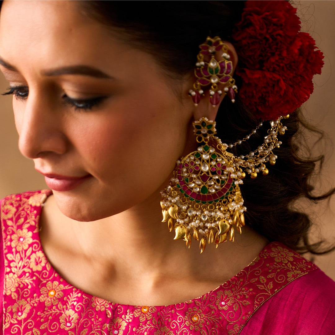 SJK003- White Colour Gold Plated Jadau Kundan Studs with Kaanchain wore by Sonia Rathee